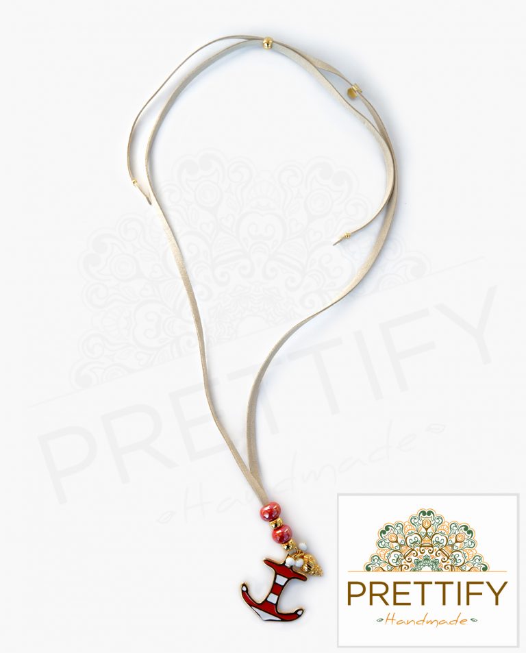 Μακρύ κολιέ με άγκυρα σε κόκκινο-λευκό χρώμα δεμένο σε σουέτ κορδόνι και διακοσμημένο με κρυσταλλάκια, κεραμικές πέτρες και κοχύλι.