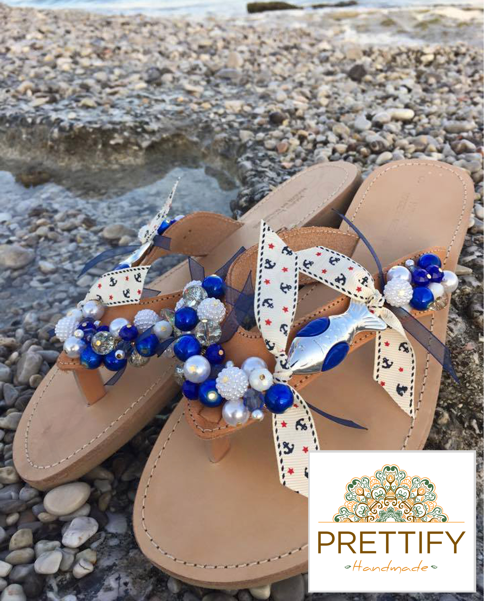 Σαγιονάρες με γυάλινα κρύσταλλα και μεγάλο ψάρι σε λευκό και μπλε χρωματισμούς.